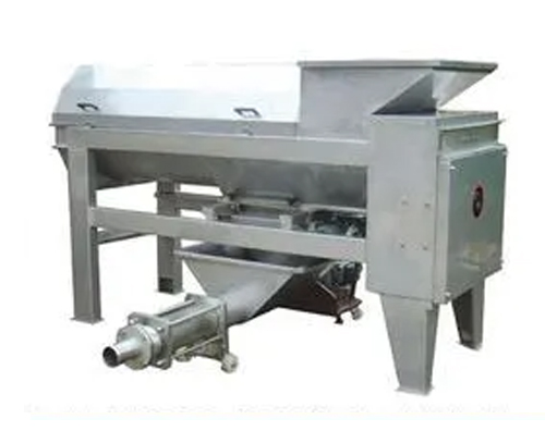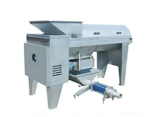 石榴從進料斗進入上破碎裝置,上破碎裝置將石榴壓開,兩輥間隙為20毫米,然后進入下破碎裝置,下破碎裝置再次將石榴擠壓,兩輥間隙為10毫米,經(jīng)過兩級擠壓的石榴已基本皮籽分離,并落入分離裝置,在攪拌軸的攪拌下,石榴籽從篩孔落下,石榴皮從尾部排出,上下破碎輥為彈性結構,間隙可調(diào)。石榴籽及汁用螺桿泵送至壓榨機。