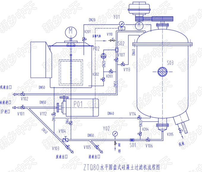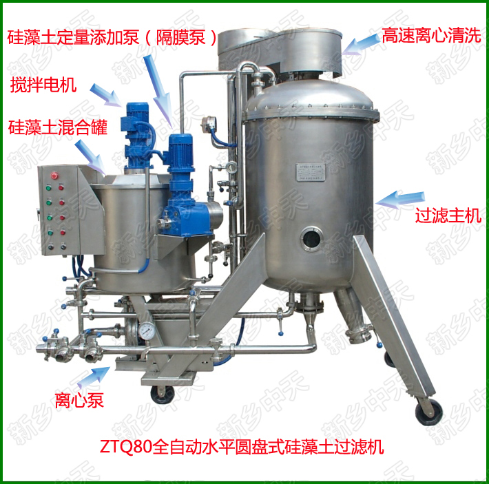 過(guò)濾時(shí),首先在過(guò)濾盤(pán)上形成硅藻土預(yù)涂層。被過(guò)濾的液體經(jīng)硅藻土預(yù)涂層時(shí),其中的雜質(zhì)即被阻擋;而純靜的液體經(jīng)過(guò)微觀管狀或片狀的間隙以及顆粒之間的間隙通過(guò)過(guò)濾層,從而起到過(guò)濾作用。隨過(guò)濾時(shí)間的推移,在預(yù)涂層上被濾掉的雜質(zhì)會(huì)越來(lái)越多,且將阻塞過(guò)濾通道。因此在過(guò)濾過(guò)程中,還需對(duì)進(jìn)入過(guò)濾罐的被過(guò)濾的液體,添加一定劑量相應(yīng)粒度的硅藻土,以維持正常的過(guò)濾過(guò)程。另外,如果過(guò)濾時(shí)需要脫色,還需加入一定比例的活性炭。
